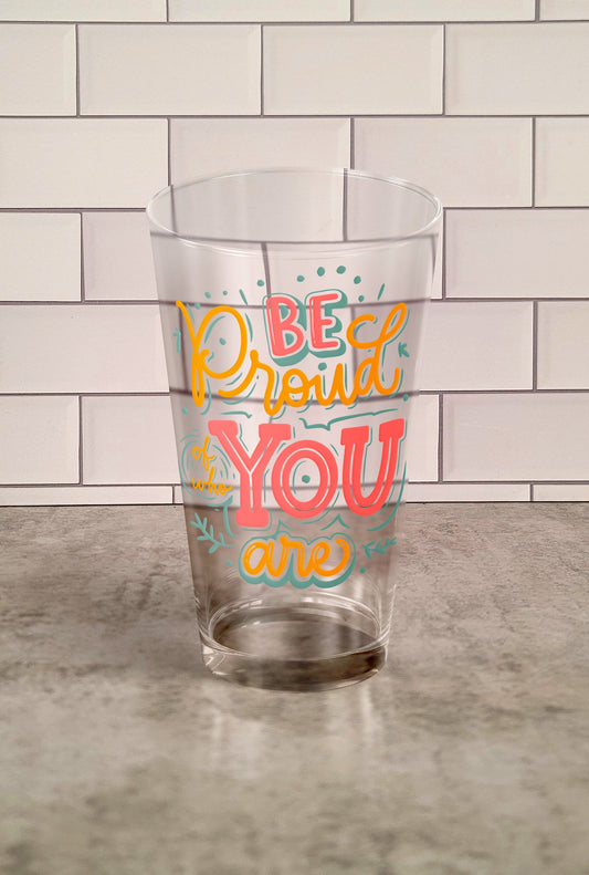 Be Proud of Who You Are Pint Glass – LGBTQ+ Pride Motivational Tumbler